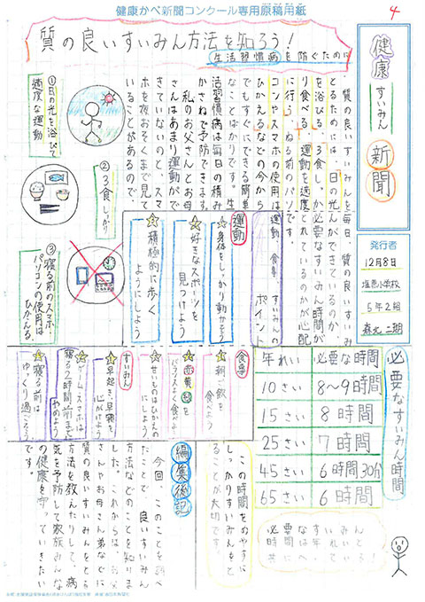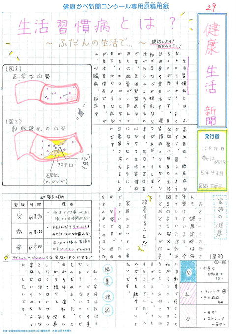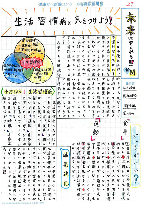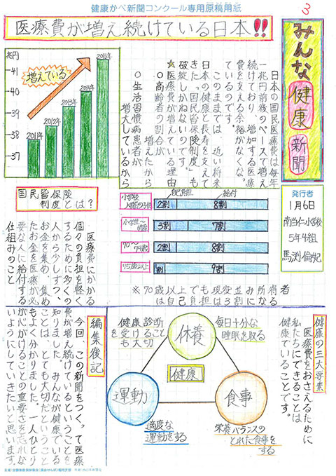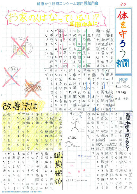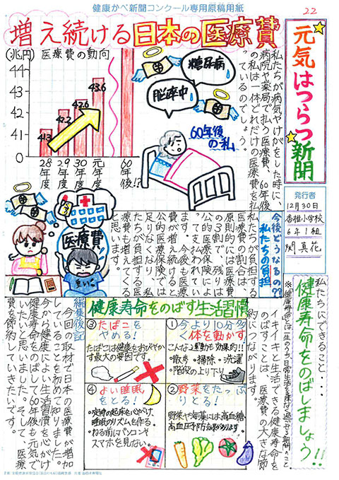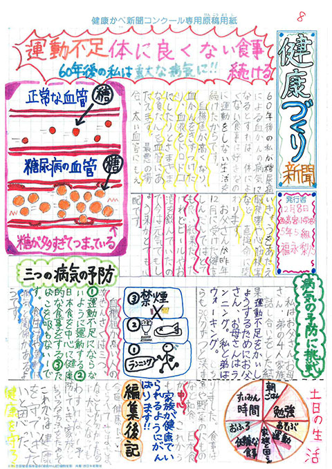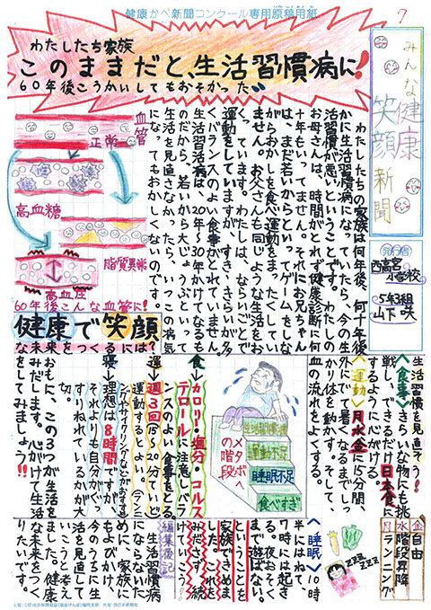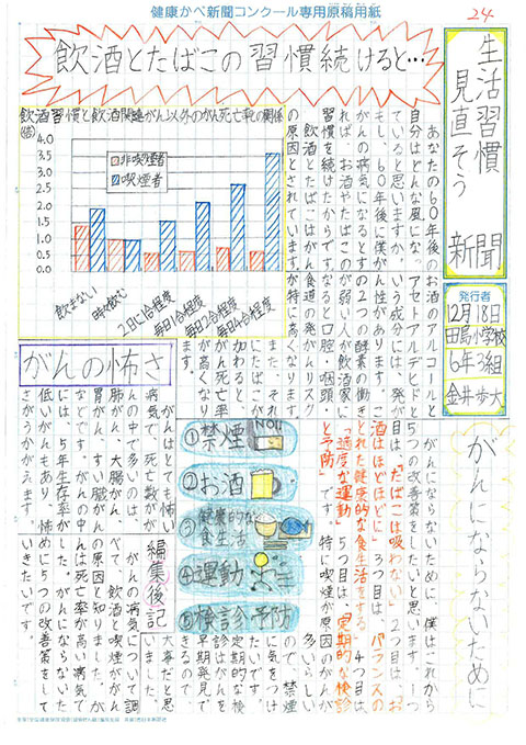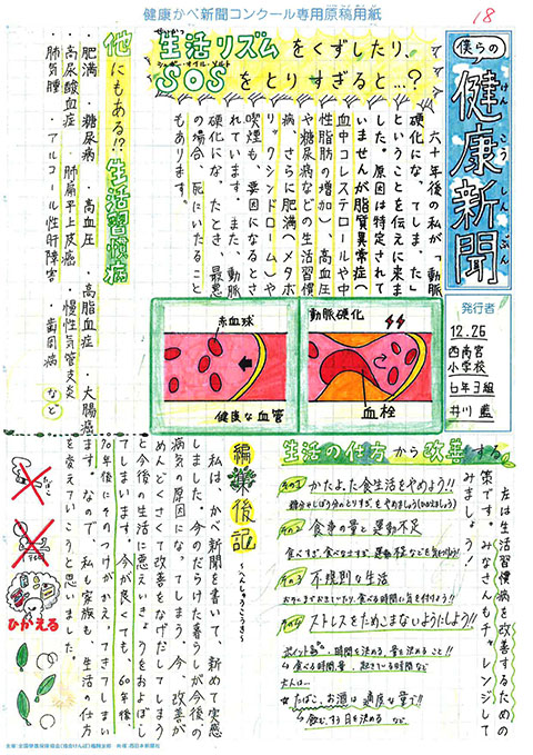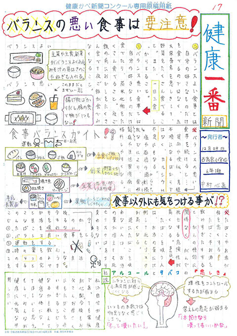 第1回 健康かべ新聞コンクール 受賞作品 最優秀賞 福岡市立西高宮小 5年3組 山下やました 咲さき 作品はこちら 優秀賞 福岡市立西高宮小 5年5組 福永ふくなが 梨乃りの 作品はこちら 福岡市立草ヶ江小 5年4組 佐藤さとう 千依ちより 作品はこちら 審査員特別賞 福岡市立南当仁小 5年4組 馬渕まぶち 倫妃りん 作品はこちら 福岡市立塩原小 5年2組 森北もりきた 二瑚にこ 作品はこちら 入選 福岡市立西高宮小 6年1組 中村なかむら 心嘉みひろ 作品はこちら 福岡市立西高宮小 6年3組 井川いかわ 藍らん 作品はこちら 福岡市立香椎小 6年1組 関せき 真花まなか 作品はこちら 福岡市立田島小 6年3組 金井かない 歩大あゆと 作品はこちら 福岡市立草ヶ江小 5年4組 前まえ ひなの 作品はこちら 福岡市立草ヶ江小 5年4組 岡﨑おかざき 万亜子まあこ 作品はこちら ※学年、組は受賞当時のものです これまでの受賞作品にもどる